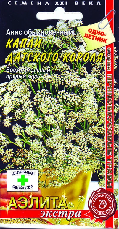 Однолетнее растение семейства Сельдерейные. Стебель высокий (60-70 см), ветвящийся в верхней части. Соцветие - сложный зонтик (до 15 простых зонтиков). Цветки белые, мелкие. Зрелые плоды зеленовато-серые с пряным запахом, сладковатые на вкус. Анис обладает интенсивным, легким, освежающим пряным ароматом. Семена входят в состав большинства пряных смесей. Анис придает рыбе ясно выраженный пряный аромат и улучшает ее вкус; благодаря сильным антиокислительным свойствам препятствует "ржавлению". С анисом готовят сырные закваски, овощные и крупяные блюда, ароматизированные напитки (в т.ч. делают настойки), хлебобулочные и кондитерские изделия, квасят капусту, солят огурцы, добавляют его и в моченые яблоки. Анис хороший медонос.
