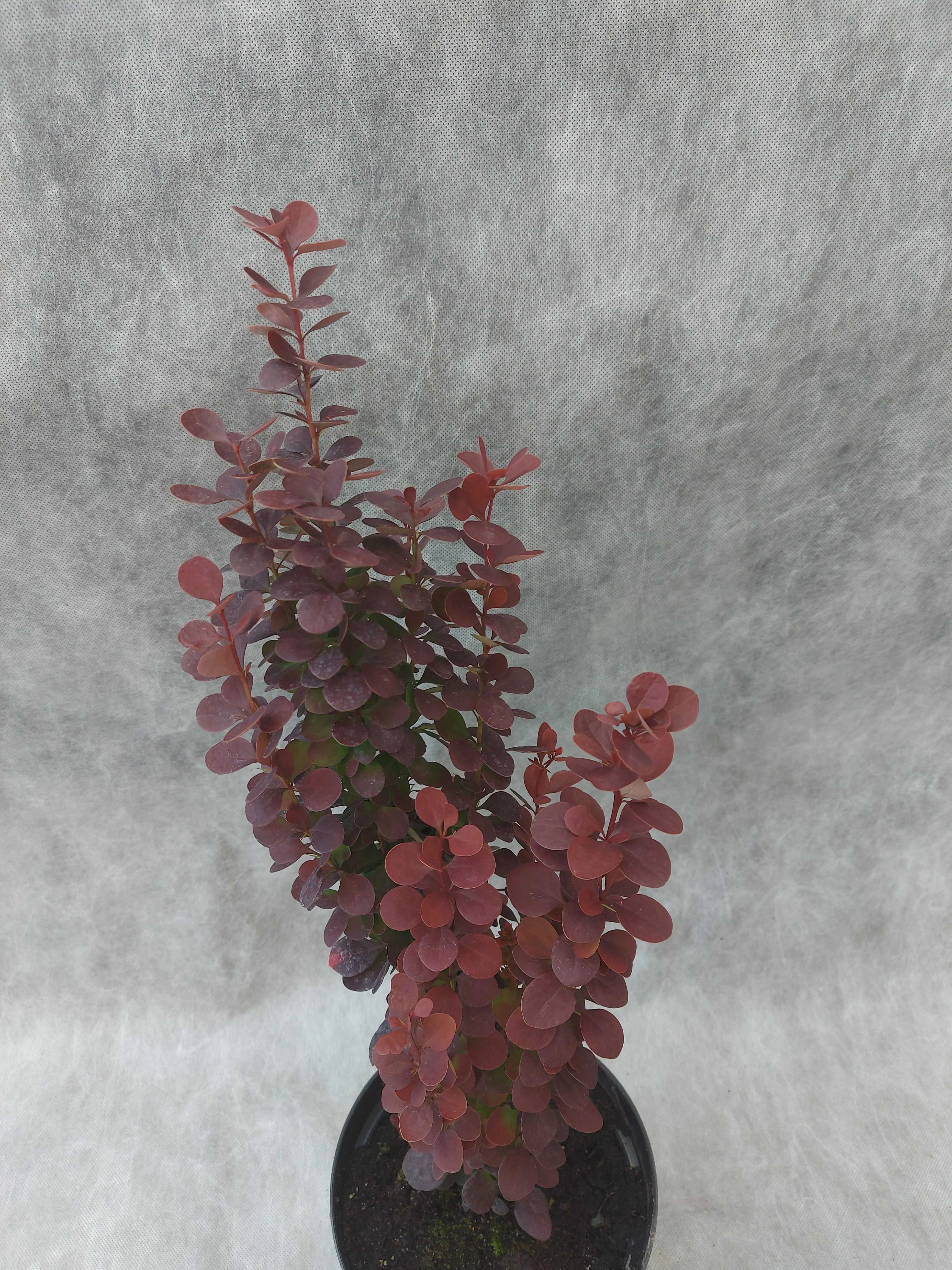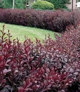 Листья округлые, коричнево-красно-фиолетового цвета. Красиво контрастируют с красными стеблями. Цветет ярко-желтыми цветками в мае.