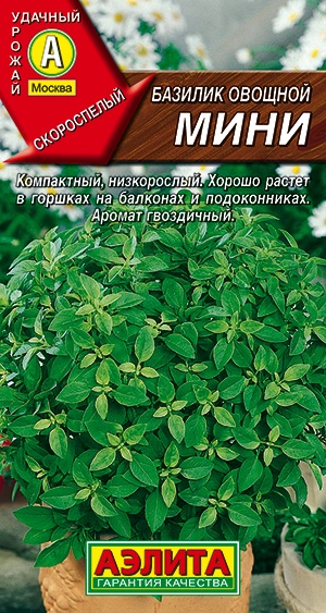 Скороспелый (60-70 дней от всходов до цветения) сорт. Куст компактный, шаровидный – 20-25 см в диаметре, густооблиственный. Листья мелкие, с сильным гвоздичным ароматом. Листья и молодые побеги в свежем виде используются в качестве салатной зелени и пряно-вкусовой добавки к блюдам домашней кулинарии. Зелень является превосходным натуральным ароматизатором, широко применяется при сезонном консервировании овощей. Растения смотрятся очень декоративно, хорошо растут в горшках на балконах и подоконниках.