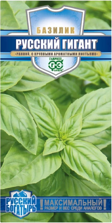 Ранний (от всходов до технической спелости 50-60 дней) сорт крупнолистного базилика с зелеными, сладкими листьями впечатляющего размера. Приятный гвоздичный вкус и пряный аромат придаст пикантности салатами и супам, гармонично дополнит блюда из рыбы и мяса, прекрасно сочетается с чесночным соусом. Растение прямостоячее, высотой 50-60 см. Базилик обладает тонизирующими свойствами, улучшает пищеварение. Выращивают рассадным способом или прямым посевом в открытый грунт. Посев на рассаду производят в конце марта – начале апреля. Посев в грунт в мае или начале июня. Высадка рассады в грунт – начало июня. Схема посадки 30x30 см. Предпочитает хорошо структурированные, богатые гумусом почвы. Нуждается в регулярных поливах.