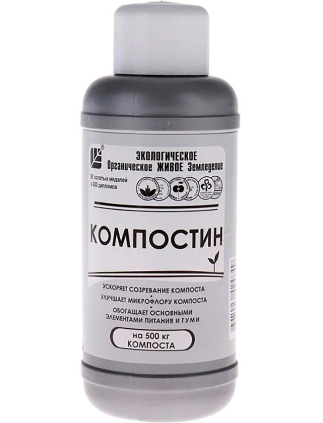 Средство Компостин позволяет получать компост с питательными веществами в сжатые сроки. Увеличивает в 10 раз и более количество микроорганизмов, перерабатывающих органику. Подобранная композиция полезных бактерий действует на весь спектр созревания и формирования перегноя.