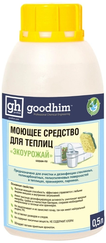 - Высокая моющая способность МОЮЩЕГО СРЕДСТВА ДЛЯ ТЕПЛИЦ GOODHIM 950 ЭКОУРОЖАЙ эффективно справляется с любыми видами атмосферных и прочих загрязнений.