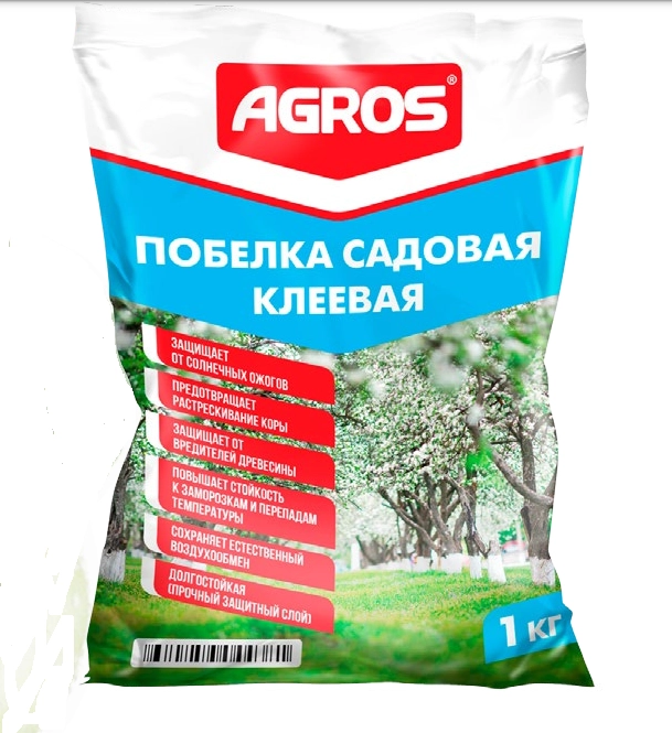Побелка садовая клеевая предназначена для защиты и декоративной отделки стволов, крупных ветвей садовых деревьев и кустарников. Образует стойкое покрытие, предохраняющее древесину от насекомых-вредителей и спор грибов-патогенов, защищает кору молодых деревьев от солнечных ожогов, повышает стойкость плодовых деревьев к заморозкам и резким температурным перепадам. Побелка не препятствует естественному воздухообмену древесины и сохраняет защитные свойства не менее одного сезона.