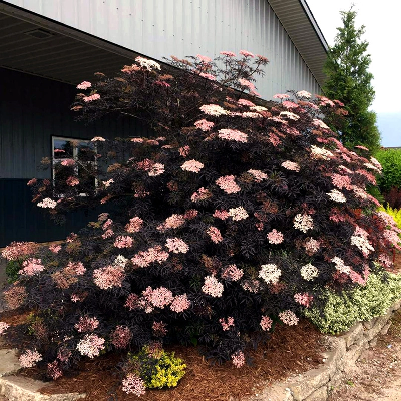 Цветы розовые, собранные в крупные, слегка выпуклые, зонтиковидные соцветия диаметром до 20 см. Цветет в мае. Плоды - шаровидные, черные, блестящие, съедобные.