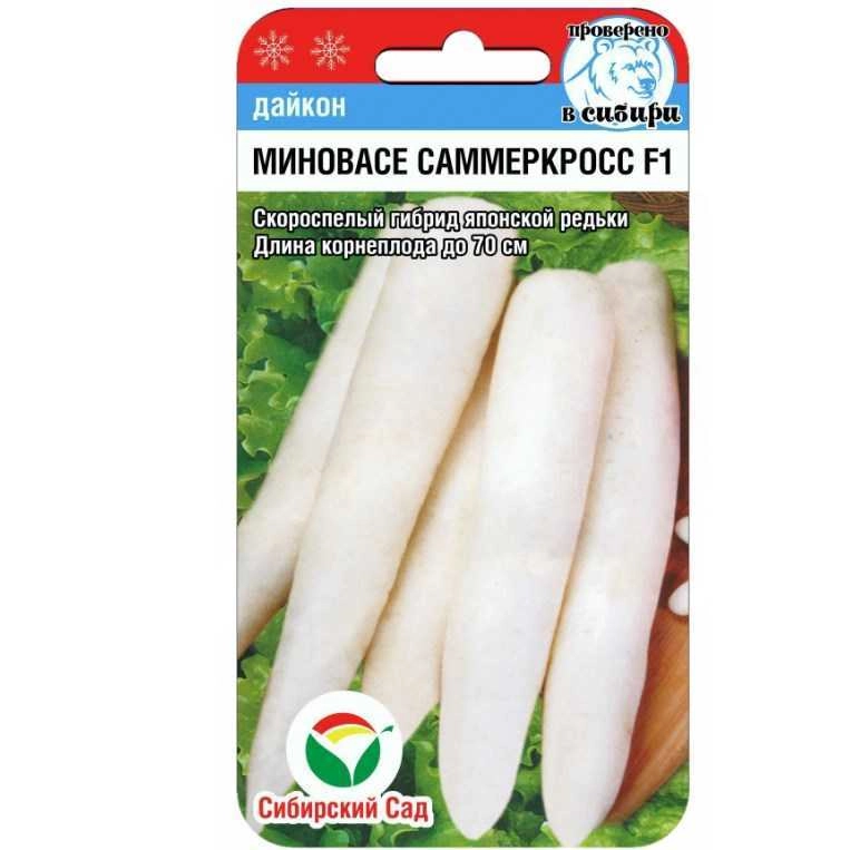 Скороспелый гибрид японской редьки. От массовых всходов до уборки урожая 40-45 дней. Корнеплоды белые, цилиндрические, гладкие, сочные и нежные, без острого редечного вкуса. Длина корнеплодов данного гибрида может достигать 70 см, поэтому перед посевом необходимо глубоко обрабатывать почву. Дайкон используют в свежем, вареном и солёном виде, прекрасно хранят до весны. В лечебных целях дайкон, как и редьку, используют при простуде, для укрепления волос, при заболеваниях желчного пузыря, печени и почек.
