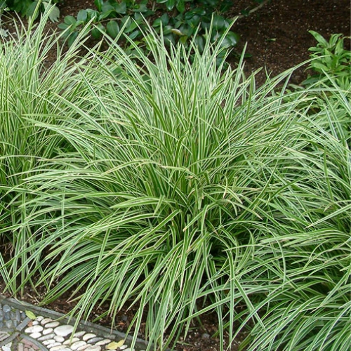 Сорт Ice Dance, лист с широкой кремово-белой полосой, полувечнозеленая листва высотой до 25-30 см. Диаметр отдельного куста до 35 см. Листья широкие, дуговидные. Может расти и на солнечных местах и в полутени. Нетребовательна к влажности почвы.