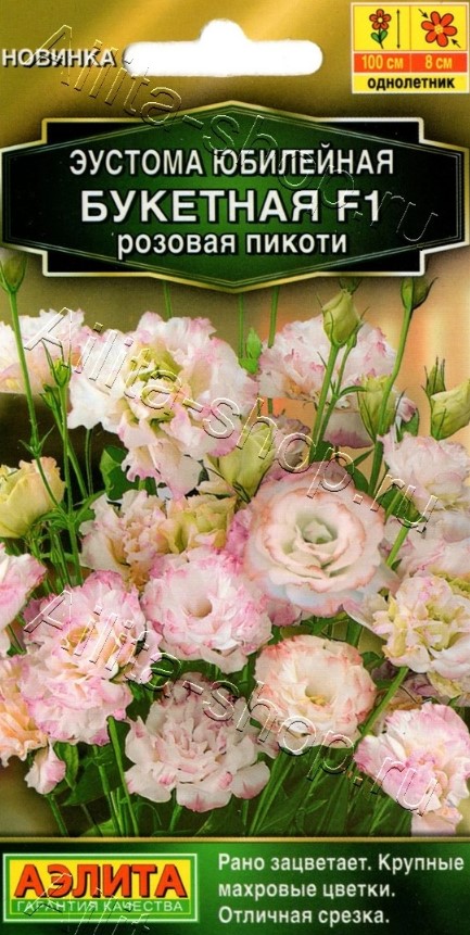 Серия гибридной крупноцветковой эустомы. Одна из лучших по своим генетическим свойствам. Изящные крепкие кус тики достигают высоты 90-100 см. Отлично ветвятся, одно временно образуя целое море пышных цвет ков диаметром 7-8 см. Махровая эустома – это, пожалуй, самое модное растение для букета и цветочного оформления, особенно в свадеб ном дизайне. В срезке нежные лепестки надолго сохраняют свежесть и опрятный вид. Растения можно выращивать в домашних условиях с обязательным досвечиванием. Для обильного и длительного цветения рекомендуются подкормки раз в 10 дней.