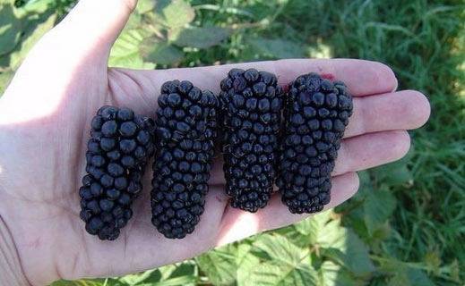 Ягоды сорта Блэк Сатин черные округлые, вытянутой формы, вес каждой достигает 4-7 г, соединены в кисти по 12-15 штук. При правильном уходе и равномерном орошении ягоды вырастают более крупные приятного вкуса со слабой кислинкой. Один взрослый куст сорта Блэк Сатин может дать до 35 кг ягод ежевики.