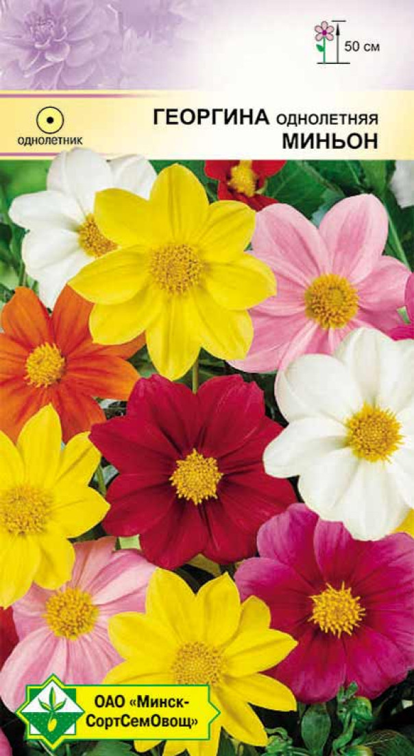 Однолетнее роскошное растение высотой 40-50 см. Обильно цветет с июля до заморозков. Соцветия разнообразных окрасок, в диаметре 7-10 см, немахровые. Для цветников, балконных ящиков, великолепно смотрится в букетах. Семена на рассаду высевают в начале апреля (в мае возможен посев непосредственно в грунт). Рассаду высаживают после окончания заморозков. Осенью клубни можно выкопать и сохранить до весны.
