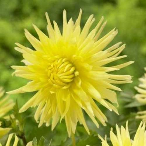 Георгина Стар Спектакль относится к бахромчатым сортам. Золотисто-желтые лепестки причудливо изогнуты. Рассеченные кончики могут иметь легкий оранжевый окрас. Диаметр распустившегося цветка нередко достигает 20 см в диаметр.