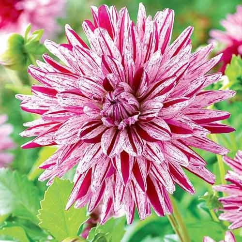 Луковицы Георгины полукактусовой Блэкберри Риппл помогут облагородить цветники, клумбы, бордюры с середины лета до осени. Георгины прекрасно смотрятся в срезанных букетах, долго сохраняя свежесть и красоту. Растение достигает 110 сантиметров в высоту, диаметр цветков 12-13 сантиметров. Обильное ветвление стеблей и многочисленные перистые листья с цветами делают георгину центром внимания. Соцветия-корзинки и лепестки в виде скрученных трубочек придают махровому цветку оригинальность, а белый окрас с многочисленным лиловым крапом выделяют эту георгину среди других сортов. Многолетник предпочитает солнце, полив и подкормку. Осенью луковицы, выкопав, убирают на хранение.