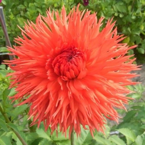 Обворожительная георгина из группы Полукактусовые георгины (9 группа).Бордюрная георгина среднего роста. Соцветия в ярких оттенках оранжевого и коралла цвета с более темным центром.