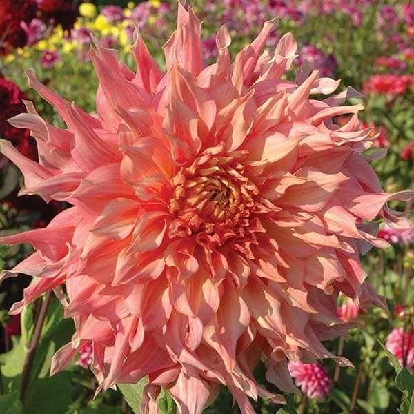 Георгина декоративная макси Penhill Watermelon (Пенхилл Уотермелеон) - крупноцветковый сорт. Высокие прочные стебли украшают махровые цветы, поистине гигантского диаметра. Лепестки, широкие у основания, заостряются ближе к кончику. Окраска их нежная, розово-кораллового цвета. Сорт является великолепным украшением любого сада. Продолжительное цветение с июля по сентябрь. Для более обильного цветения удаляют боковые бутоны. Идеально подходит для посадки как в одиночных, так и в групповых композициях. Высаживают георгины на хорошо освещенных, защищенных от ветра местах. Предпочитают легкую, плодородную землю. Уход заключается в обильном поливе и прополке. Размножение происходит путем деления клубней. На зиму клубни выкапывают, просушивают и хранят в сухом прохладном месте.