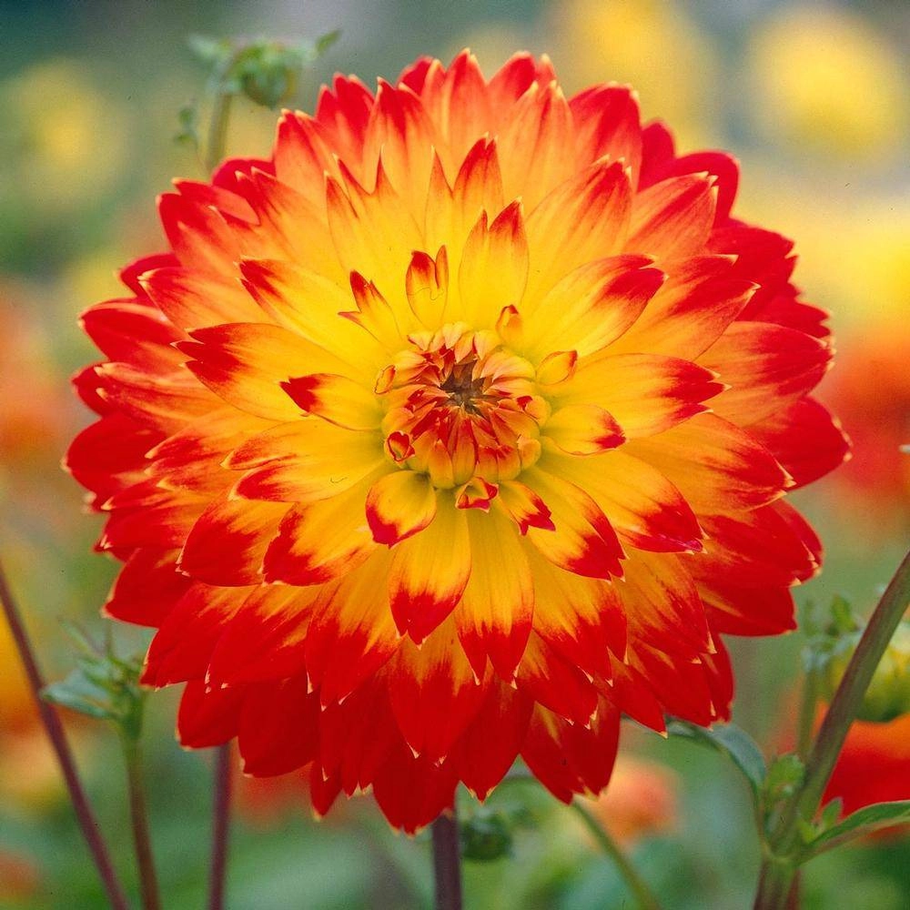 Георгина Procyon привлекает своим ярким окрасом. Крупные соцветия окрашены в ярко-желтый цвет с ярко-красными кончиками лепестков. Она будет радовать своим цветением со средины лета и до октября месяца. Высота георгин достигает 120 см, диаметр цветка до 25 см. Так как растение высокое, оно отлично будет выглядеть в одиночной посадке. В апреле клубни георгин следует подготовить к посадке. Клубни высаживают в емкость с питательной землёй или торфом так, чтобы они выступали на 2-3 см над поверхностью, и держат их две недели при температуре не ниже 18 °C при хорошем освещении. Высаживать георгины в грунт можно тогда, когда земля прогреется, обычно это делают в конце мая или начале июля. Ямки под георгины должны быть больше комка корней в три раза, чтобы корни георгина погрузились в них полностью и осталось ещё 5-7 см. Если вы выбрали сорт высокорослых георгин, установите и закрепите сразу опору для будущего стебля. После посадки обильно полейте саженцы холодной водой, а почву вокруг них замульчируйте. Поливать георгины нужно обильно 1-2 раза в неделю, но не позволяйте влаге застаиваться в корнях. Поскольку у георгин полый стебель, и сильный ветер или дождь могут сломать его, необходимо подвязать георгин к опорному колышку. После первых заморозков клубни георгинов нужно выкопать, обрезать оставшуюся листву и пагоны, оставив лишь пять-десять сантиметров стебля. Лучше всего хранить клубни георгин при температуре 3-5 °C при влажности воздуха 60-70 % в хорошо проветриваемом помещении.