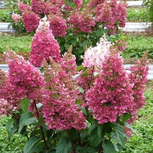 Описание: Цветы собраны в крупные конусовидные соцветия по 15-20 см в длину, двухцветные - сверху белые, ниже пурпурно-розовые. Цветет с июля до сентября.Форма куста широкоокруглая, не разваливающаяся. Молодые побеги красновато-бурые, немного опушенные. Листья шершавые, широкие, зеленые, с выраженной красноватой осенней окраской.
