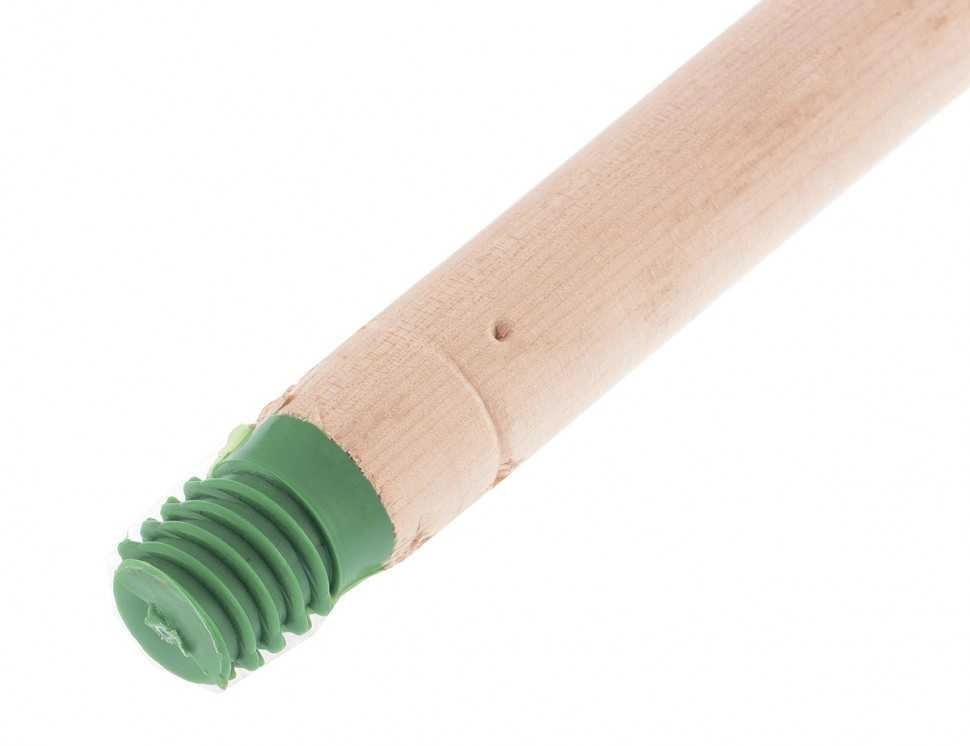 Деревянный черенок с затыловкой изготовлен из березы высшего сорта. Двойное шлифование делает поверхность черенка гладкой. Благодаря сушке в термокамере исключается возможность возникновения плесени. Окончание черенка выполнено в виде пластикового резьбового наконечника для насаживания инструмента с резьбовой тулейкой. Диаметр адаптирован под посадочное место метел и щеток.