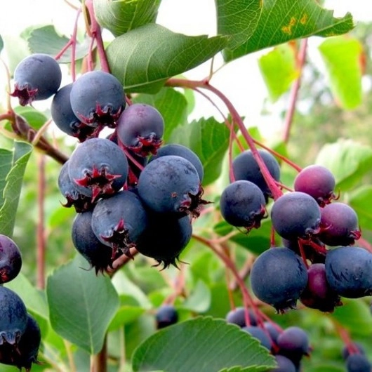 Отличительной чертой ирги является густая крона из зеленых или сизых листьев. Во время плодоношения на культуре появляются маленькие плоды с розовыми бочками, которые собраны на одной кисти. Неспелые плоды имеют кремовый оттенок, по мере поспевания становятся фиолетовыми или пурпурными.