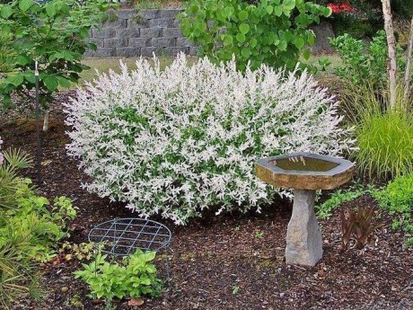 Узкие, длинные (до 10 см) и слегка продолговатые листья, на ветвях расположены супротивно. А вот окраска листвы весьма разнородна: на концах побегов листья белоснежные, а в середине кроны – пестрые. Причем, молодые листья, распускаясь, окрашены в нежный салатовый цвет, а с возрастом на них появляются штрихи и пятна белого и пурпурного цвета. Чем старше лист, тем светлей и однотонней его окраска, а штрихи остаются редкими, хотя и яркими. В жаркое время листья немного бледнеют и тускнеют.