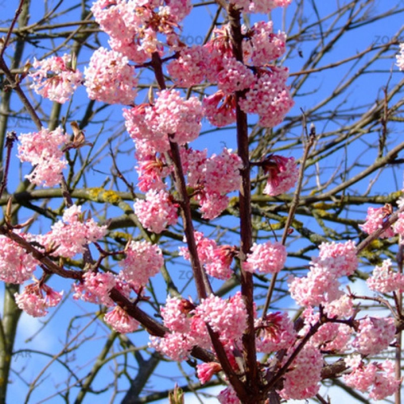 Калина душистая Фаррера ранней весной сразу после схода снега цветет нежнейшими соцветиями розового цвета. При этом в воздухе витает сильный сладкий аромат. У растения пахнут даже листья.