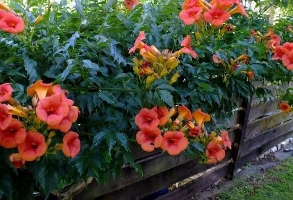 Цветки оранжевые трубочки-колокольчики, длиной до 6 см, внутри рябинно- красные, собранны в крупные кисти. Цветение начинается в июне и длится до заморозков. Цветение обильное и красочно. Интересно, что на ветвях лианы одновременно есть и бутоны, и цветки, и плоды.