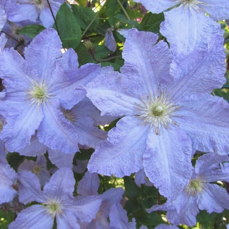 Лиана высотой 2-3 метра, диаметр цветка 10-15 см. Чашелистики небесно-голубого цвета с волнистыми краями, пыльники светло-желтые. Цветение обильное и продолжительное, с июля до заморозков.