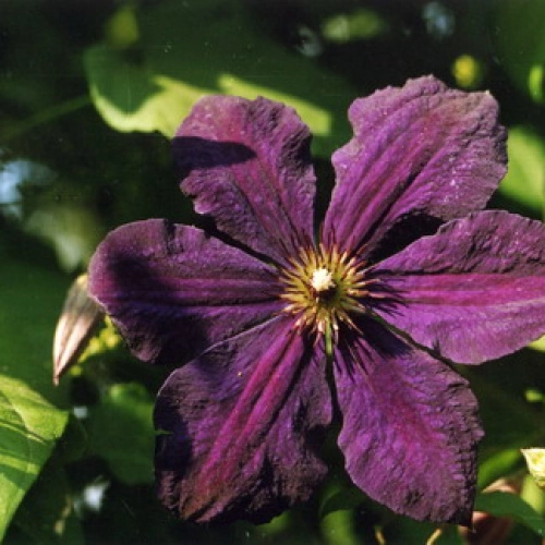 Клематис крупноцветковый сорт Негритянка (Negritianka ) - цветки тёмно-фиолетово-пурпурные с пурпурными пыльниками на кремовых тычиночных нитях. Цветёт обильно с конца июня по сентябрь. Рост сильный. Нуждается в сильной обрезке. Исключительно малотребователен. Особенно хорош для использования на светлом фоне. Можно выращивать для ограждений, беседок, решёток и других садовых опор. Может карабкаться по натуральным опорам, напр. лиственным или хвойным кустарникам. Хорошо сочетается с жёлтыми листьями или цветками соседних растений.