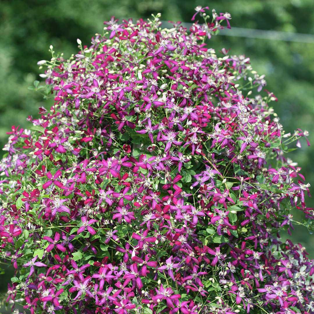 Исключительный и уникальный клематис. Цветочки небольшие (3-4.5 см), красно-пурпурные, бархатные, на пике цветения они практически полностью покрывают листву. Цветёт обильно в июле-августе, затем до октября, но уже слабо. Очень ароматный.
