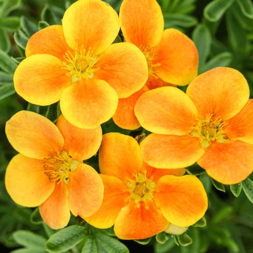 Лапчатка кустарниковая Сансет – ярко-оранжевый сорт, вырастающий до 60 см в высоту. Крона подушковидная. Листья мелкие, темно-зеленые, сложные. Цветение очень обильное. Цветки средних размеров (до 5 см в диаметре), ярко-оранжевого цвета. Цветение начинается в середине июня и длится до наступления устойчивых заморозков в начале октября.