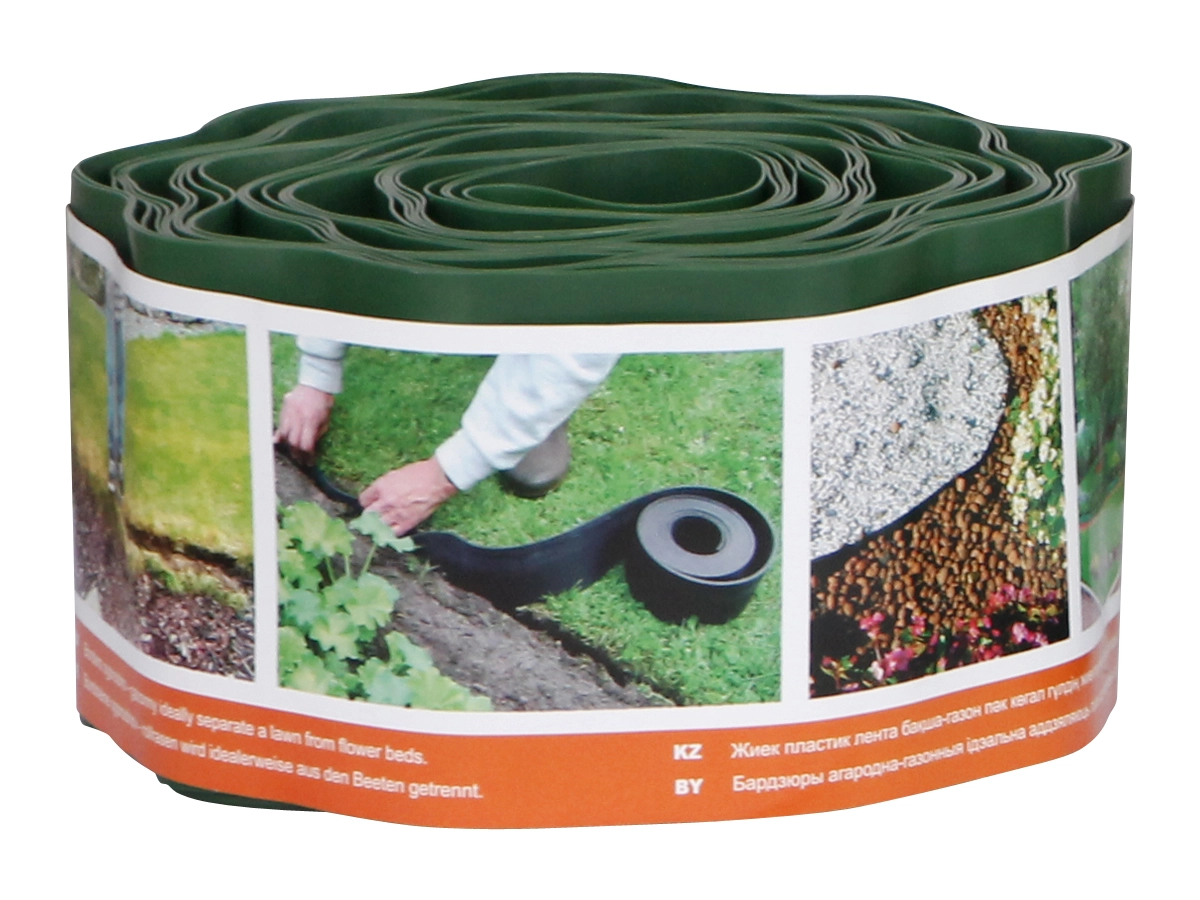 Бордюрная лента очень проста в применении. Она легко режется ножницами, сгибается под любым углом. Лента вкапывается вертикально в землю таким образом, чтобы край бордюра немного выступал над поверхностью почвы.