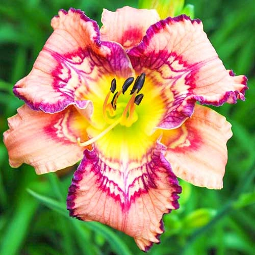 Лилейник Гет Джигги — один из самых нарядных сортов с так называемой калейдоскопической окраской кремовых цветков: на лепестках расположены до 9 горизонтальных ярко-лиловых полос и такая же кайма. Горло цветка желто-зеленое, сам бутон при полном раскрытии достигает 17 см в диаметре. Кусты рослые, цветоносы поднимаются на высоту до 1 метра, количество бутонов на каждом может достигать 20. Чем старше растение — тем больше полос на лепестках и ярче рисунок. Цветение приходится на июнь-июль и может быть повторным.