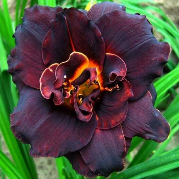 Один из самых тёмных лилейников, которые вы когда-либо могли видеть! И этим не ограничивается уникальность сорта. Цветы лилейника необычайно насыщенной окраски: это темно-пурпурный бархатистый цветок с огненно-желтой горловиной. Волнистые края лепестков украшены тончайшей желтой полосой. Цветы пышные, с лёгкими, но плотными лепестками. На солнце у лепестков появляется рубиновый оттенок. Диаметр цветов 14 см, высота куста – до 55 см. Повторно цветущий. Лилейник Вуду Дансер одинаково прекрасно смотрится как с жёлтыми, так и с красными и розовыми сортами цветов.