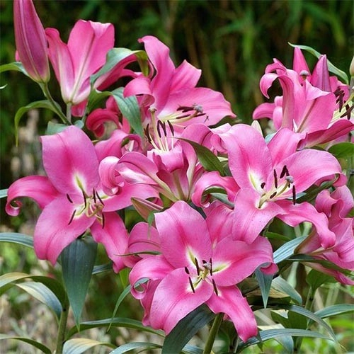 Лилия Robina - насыщенные, яркие цвета, огромные размеры и великолепный аромат. Лилия расцветает в июле, образуя превосходные огромные цветы яркого малиново-розового оттенка с бело-зеленой звездочкой у основания горла и небольшим количеством вишневых папилом. Лепестки у цветка лилии широкие и плотные, кончики причудливо закручены назад, а края лепестков слегка волнистые. Диаметр цветка лилии Робина обычно более 25 см, с сильным благоухающим ароматом. Продолжительность цветения 2-3 недели. На высоком, до 150 см стебле лилии Робина обильно расположены листья темно-зеленого оттенка, на самой макушке образуется до 15 бутонов. Цветоносы великолепно смотрятся в срезке. Широко применяется лилия Robina для озеленения, любая клумба благодаря ей приобретает королевский вид. Эту лилию можно отнести к так называемым лилиям-деревьям за огромные размеры цветов и большую высоту стебля.