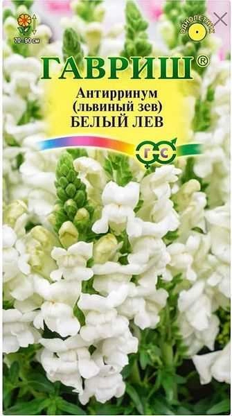Антирринум (Львиный зев) Белый Лев великолепный крупноцветковый срезочный сорт. Декоративное растение из семейства Норичниковые, культивируемое как однолетник, высотой 70-90 см. Цветет с конца июня до поздних заморозков. Цветки собраны в кистевидные соцветия белой окраски. Антирринум (Львиный зев) Белый Лев холодостоек, светолюбив, к почвам нетребователен, в засушливый период нуждается в поливе. Выращивают рассадным способом. Для получения дружных всходов семена необходимо стратифицировать при температуре +10оС. Посев проводят с начала марта до середины апреля, поверхностно, не заделывая, в ящики с субстратом и ставят на свет. Всходы появляются через 8-12 дней. Рассаду высаживают во второй половине мая с расстоянием между растениями 35-40 см. Используется для групповых посадок и цветников, а также для получения высококачественной срезки (львиный зев стоит в воде до двух недель).