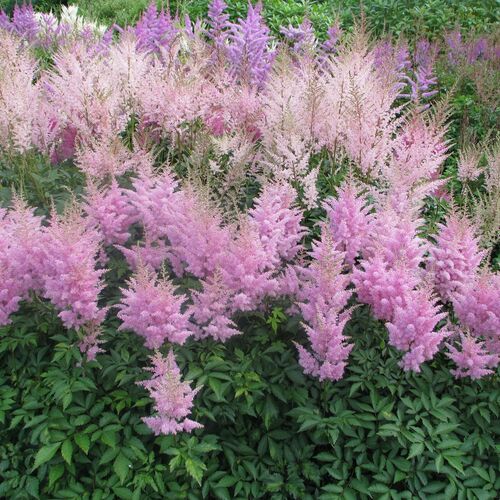 Высокая, статная астильба с обильным и пышным цветением. Цветки с выраженными лепестками, сиренево-лиловые, собраны в изящные крупные соцветия. Если метелки не срезать после цветения, то они послужат украшением сада всю зиму.