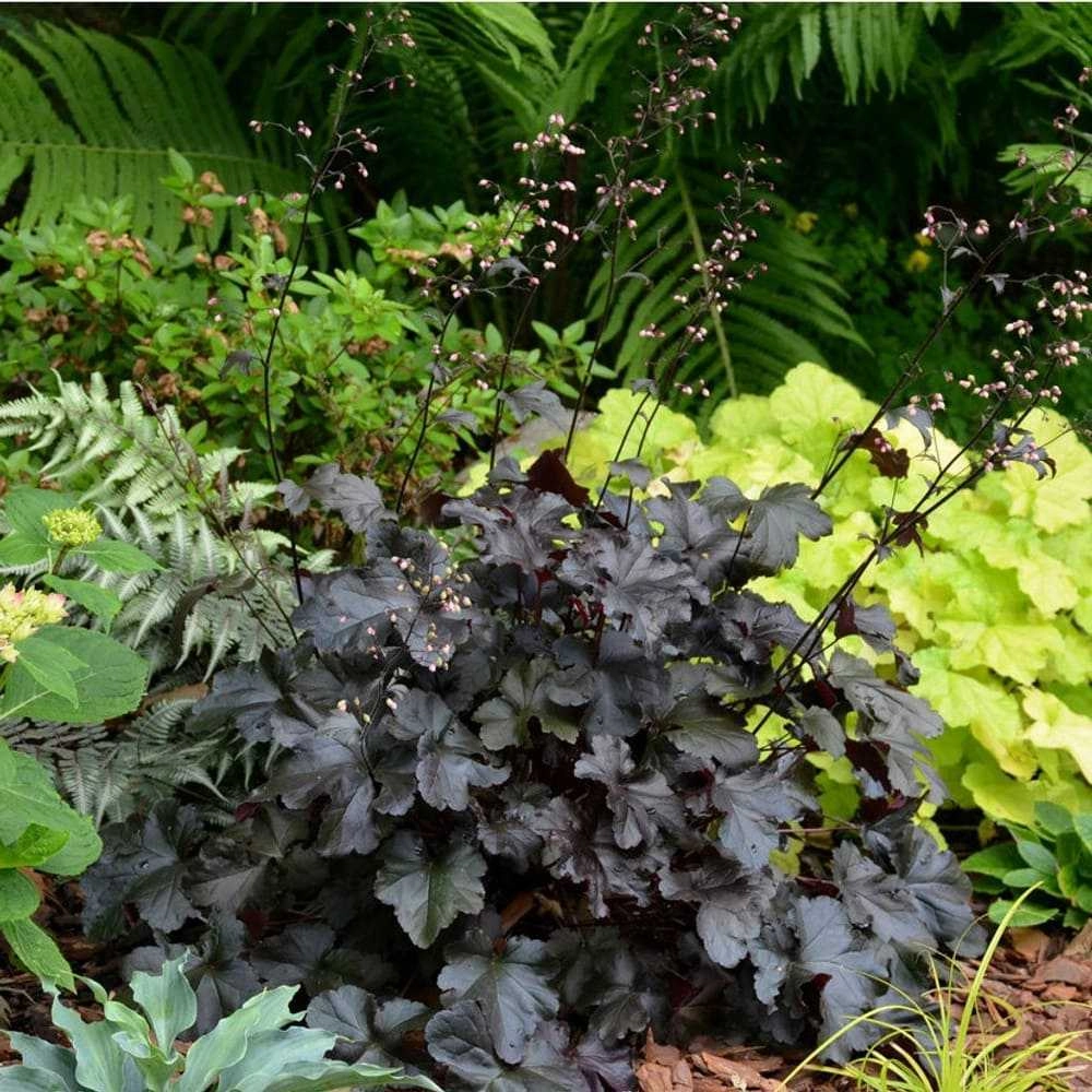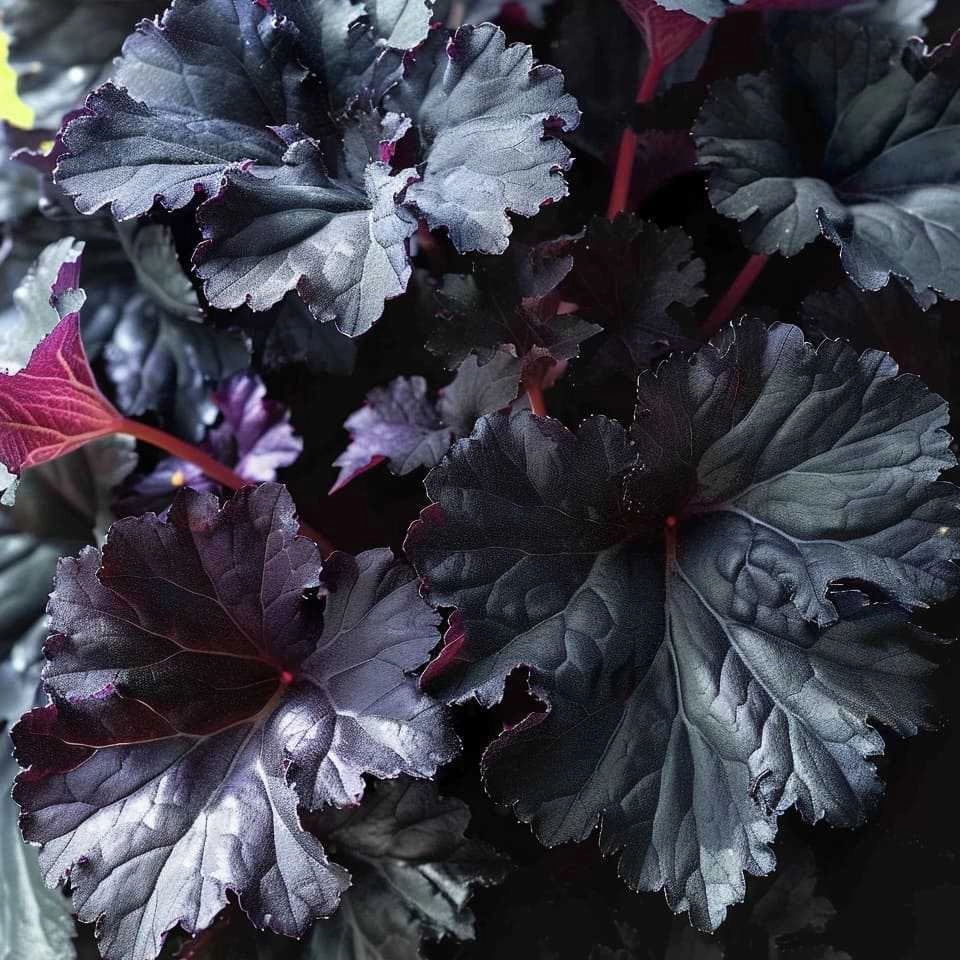 Гейхера Black Pearl — многолетний, вечнозеленый, декоративный кустик образует невероятно плотную прикорневую розетку из листьев. Высота до 40 см, диаметр до 50 см. Листья не разваливаются и не желтеют раньше времени. Нарастает легко. Листва у гейхеры Блэк Перл практически черная, блестящая, с волнистыми, как бы взъерошенными краями, с тёмно-фиолетовыми прожилками. Обратная сторона листа – розово-фиолетовая.
