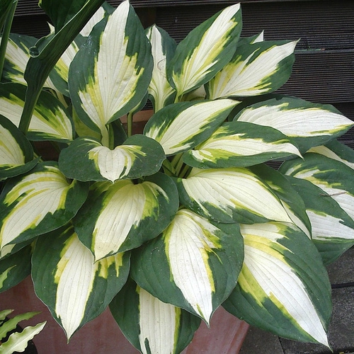 Очень эффектный сорт. Хоста имеет белый центр и темно-зелёные края. На границе мазки ярко-жёлтого цвета. Молодые листья имеют зелёные края и жёлто салатный центр.