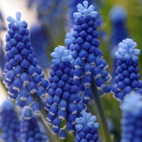 Мускари сорта Дарк Айс зацветает в период с мая по июнь. Около 40-50 шт очаровательных колокольчиков, темно-синего оттенка с белоснежной каймой, густо разместились на макушке тонкого упругого стебля. . Форма цветка бочкообразная, диаметром 0,5-0,6 см. Продолжительность цветения 3-4 недели сопровождается душистым, приятным ароматом. Высота куста мускари Dark Eyes достигает 10-25 см, с узкими темно-зелеными листьями, которые подчеркивают красоту цветка. После того как пройдет цветение, кустики очень долго сохраняют декоративный вид в саду.