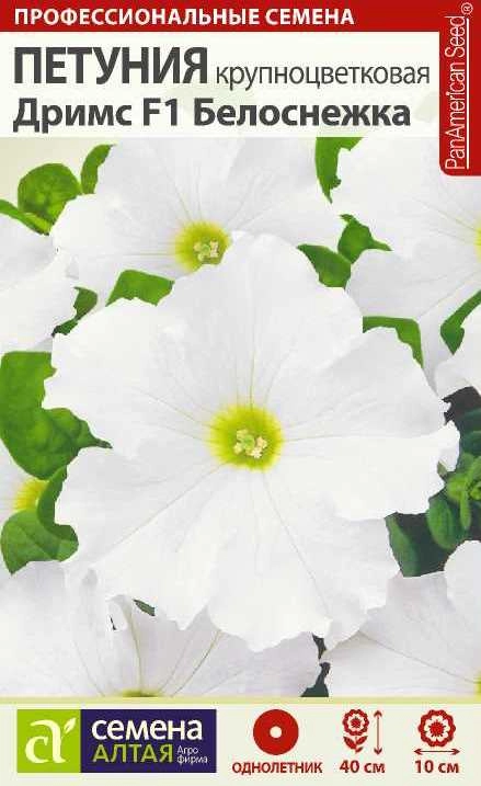 Прекрасный однолетник! Серия гибридной крупноцветковой петунии, популярное компактное красивоцветущее растение высотой 25-40 см. Отличается от других серий потрясающими насыщенными расцветками – каждый цветок имеет рисунок из четких прожилок, всегда более ярких, чем основной цвет. Петуния Дримс Белоснежка украсит Ваш уютный сад большими, диаметром 8-10 см., гофрированными цветками ярко-белого цвета. Отличается обильным и продолжительным цветением, отлично смотрится в кассетах, горшках, подвесных корзинах и на клумбах. Широко используется для составления композиций. Растение тепло- и светолюбиво, засухоустойчиво, предпочитает расти на солнечных открытых участках. К почвам нетребовательно. Семена на рассаду сеют в конце февраля-марте, их не заделывают землей, а просто накрывают ящики стеклом. Пока всходы мелкие, их лучше не поливать, а опрыскивать. На открытом воздухе продолжают выращивать с конца мая, когда минует угроза возвратных заморозков.