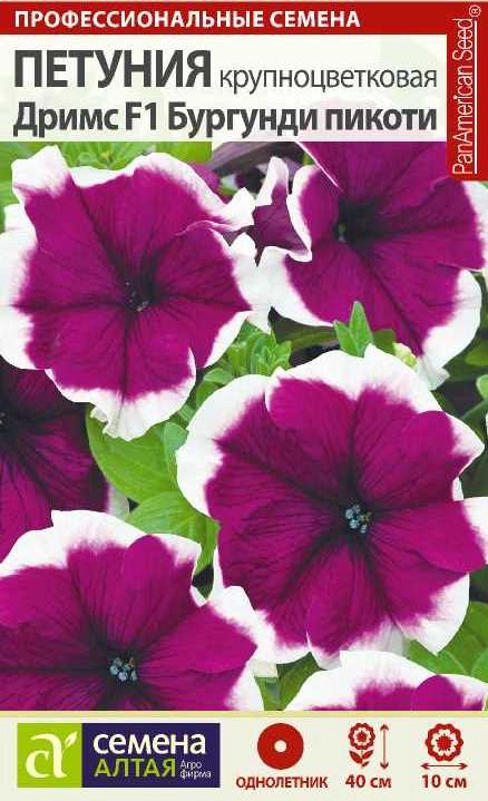 Прекрасный однолетник! Серия гибридной крупноцветковой петунии, популярное компактное красивоцветущее растение высотой 25-40 см. Отличается от других серий потрясающими насыщенными расцветками – каждый цветок имеет рисунок из четких прожилок, всегда более ярких, чем основной цвет. Петуния Дримс Бургунди пикоти украсит Ваш уютный сад большими, диаметром 8-10 см, гофрированными цветками насыщенного цвета бургунди с контрастной белой каймой. Отличается обильным и продолжительным цветением, отлично смотрится в кассетах, горшках, подвесных корзинах и на клумбах. Растение тепло- и светолюбиво, засухоустойчиво, предпочитает расти на солнечных открытых участках. К почвам нетребовательно. Семена на рассаду сеют в конце февраля-марте, их не заделывают землей, а просто накрывают ящики стеклом. Пока всходы мелкие, их лучше не поливать, а опрыскивать. На открытом воздухе продолжают выращивать с конца мая, когда минует угроза возвратных заморозков. Возможно сохранение растений зимой в освещенном помещении при t =12 С.
