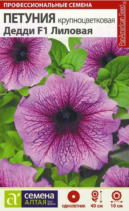 Один из самых раннецветущих однолетников, высота растений до 40 см. Отличается от других серий оригинальной окраской цветков – каждый имеет рисунок из четких прожилок, всегда более темных, чем основной цвет. Петуния Дедди Лиловая имеет крупные цветки диаметром до 10 см лиловой окраски с выразительными темно-фиолетовыми прожилками. Длительность и пышность цветения, устойчивость к непогоде - вот характеристики этого сорта. Отлично смотрится в кассетах, горшках, подвесных корзинах и на клумбах. Растение тепло- и светолюбиво, засухоустойчиво, предпочитает расти на солнечных открытых участках. К почвам нетребовательно. Семена на рассаду сеют в марте, их не заделывают землей, а просто накрывают ящики стеклом и содержат при температуре +20-240С, не допуская пересыхания оболочки гранулы. Пока всходы мелкие, их лучше не поливать, а опрыскивать. Посевы содержат при температуре не ниже +180С. В середине мая рассаду необходимо закалить, выставляя на открытый воздух. Высадка в открытый грунт проводится в июне.