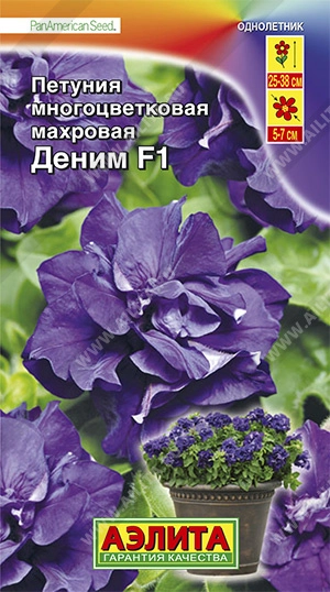 Гибридная обильноцветущая петуния Деним поражает своими характеристиками. Это чудесное растение отличается компактными побегами с аккуратными листочками и изящными махровыми цветками, которых образуется так много, что кустик напоминает цветущее облачко. Гибрид отличается прекрасным внешним видом, ранним, продолжительным и очень дружным цветением, неприхотливостью и устойчивостью к неблагоприятным погодным условиям. Петуния незаменима в оформлении клумб, бордюров, вазонов, кашпо и балконных ящиков.