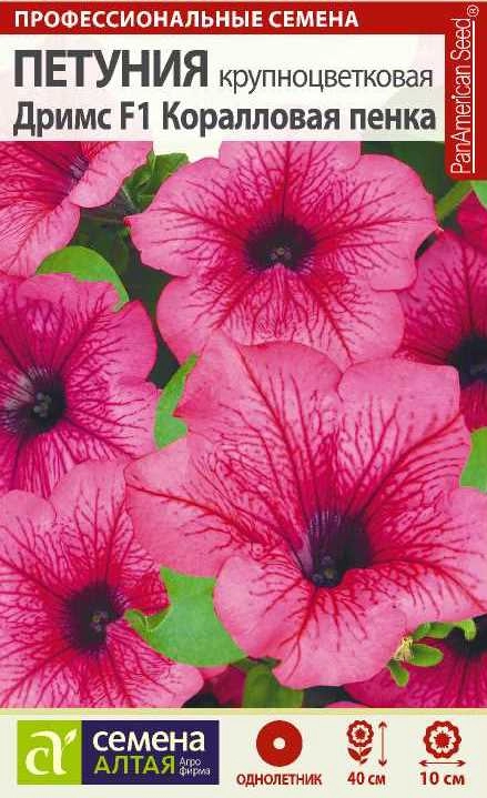 Прекрасный однолетник! Серия гибридной крупноцветковой петунии, популярное компактное красивоцветущее растение высотой 25-40 см. Отличается от других серий потрясающими насыщенными расцветками – каждый цветок имеет рисунок из четких прожилок, всегда более ярких, чем основной цвет. Петуния Дримс Коралловая пенка украсит Ваш уютный сад большими, диаметром 8-10 см., гофрированными цветками насыщенного кораллового цвета. Отличается обильным и продолжительным цветением, отлично смотрится в кассетах, горшках, подвесных корзинах и на клумбах. Широко используется для составления композиций. Растение тепло- и светолюбиво, засухоустойчиво, предпочитает расти на солнечных открытых участках. К почвам нетребовательно. Семена на рассаду сеют в конце февраля-марте, их не заделывают землей, а просто накрывают ящики стеклом. Пока всходы мелкие, их лучше не поливать, а опрыскивать. На открытом воздухе продолжают выращивать с конца мая, когда минует угроза возвратных заморозков.