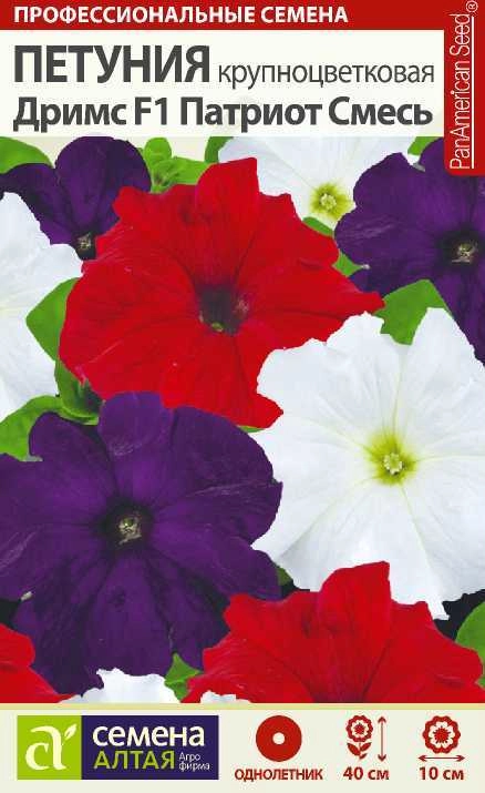 Прекрасный однолетник! Серия гибридной крупноцветковой петунии, популярное компактное красивоцветущее растение высотой 25-40 см. Отличается от других серий потрясающими насыщенными расцветками – каждый цветок имеет рисунок из четких прожилок, всегда более ярких, чем основной цвет. Петуния Дримс Патриот смесь украсит Ваш уютный сад большими, диаметром 8-10 см., гофрированными цветками насыщенных окрасок: темно-фиолетовой, красной и белой с желто-зеленым центром. Отличается обильным и продолжительным цветением, отлично смотрится в кассетах, горшках, подвесных корзинах и на клумбах. Широко используется для составления композиций. Растение тепло- и светолюбиво, засухоустойчиво, предпочитает расти на солнечных открытых участках. К почвам нетребовательно. Семена на рассаду сеют в конце февраля-марте, их не заделывают землей, а просто накрывают ящики стеклом. Пока всходы мелкие, их лучше не поливать, а опрыскивать. На открытом воздухе продолжают выращивать с конца мая, когда минует угроза возвратных заморозков.