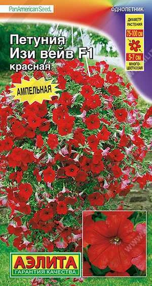Знаменитый ампельный гибрид с обильным цветением от американской компании PanAmerican Seed. Серия Изи вейв F1 принадлежит к группе многоцветковых петуний. Растение формирует цветущий «ку пол» высотой 20-25 см над кашпо и интенсивно наращивает плети длиной 75-100 см. В ландшафтном варианте образует сплошной красочный ковер высотой 15-30 см, в зависимости от расстояния между кустами. Цветки имеют нежный фиалковый аромат. При контейнерном выращивании необходимо обеспечить не менее 7-8 л грунта на одно растение.