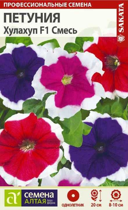Нарядный сорт крупноцветковой петунии серии Хулахуп отличается суперранним цветением, более яркой окраской цветков и волнистым краем лепестков. Растения компактные, густоветвистые с крупными цветками ярких окрасок с белой каймой по краю, диаметром до 10 см. Используется для клумб, бордюров, оконных и балконных ящиков, для вазонов и подвесных корзин. Растение светолюбивое, засухоустойчивое, хорошо растет на любых питательных почвогрунтах. Посев семян на рассаду проводят в феврале-марте. Семена слегка вдавливают в почву, землей не присыпают. Посадочную емкость накрывают стеклом и ставят в освещенное место. При температуре почвы +18-20°C всходы появляются на 14-20 день. Сеянцы пикируют в фазе 2-х настоящих листьев. Рассаду высаживают в открытый грунт после окончания весенних заморозков. Благодарно отзывается на поливы и регулярные подкормки. Спокойно переносит пересадку во взрослом состоянии.