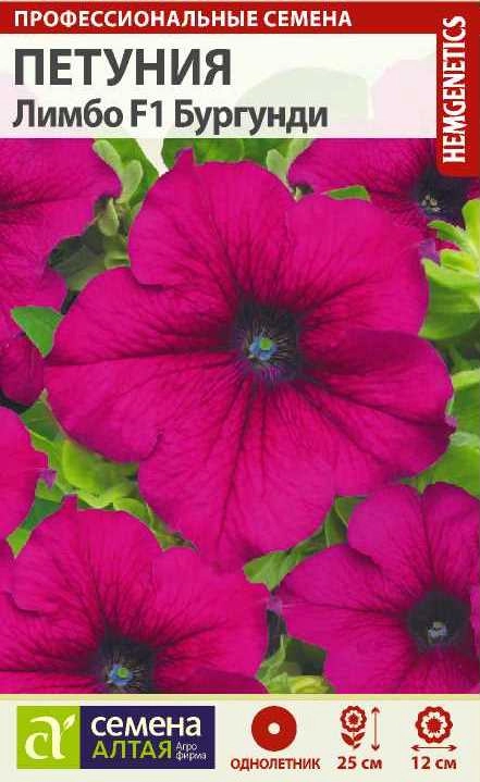 Петуния Лимбо – единственная на рынке генетически карликовая серия крупноцветковой петунии. Растение хорошо ветвится, не перерастает и не вытягивается в течение всего сезона. Не нуждается в регуляторах роста. Образует компактные кустики, покрытые крупными, до 12 см в диаметре, бордовыми цветками. Растение очень быстро восстанавливается после дождя. Цветение наступает раньше, чем у других крупноцветковых петуний. Идеальный материал для декоративного оформления балконов, фасадов зданий, городских и садовых участков. Светолюбивое и достаточно засухоустойчивое растение, не переносит переувлажнения. Предпочитает легкие плодородные, хорошо дренированные почвы. Семена дражированные, что облегчает посев. В рассаде не перерастает, имеет очень хорошее ветвление. Семена высевают в феврале-марте, не заделывая землей, а просто накрывая ящики стеклом. Пока всходы мелкие, их лучше не поливать, а опрыскивать. На открытом воздухе продолжают выращивать с конца мая. Благодарно отзывается на поливы и регулярные подкормки.