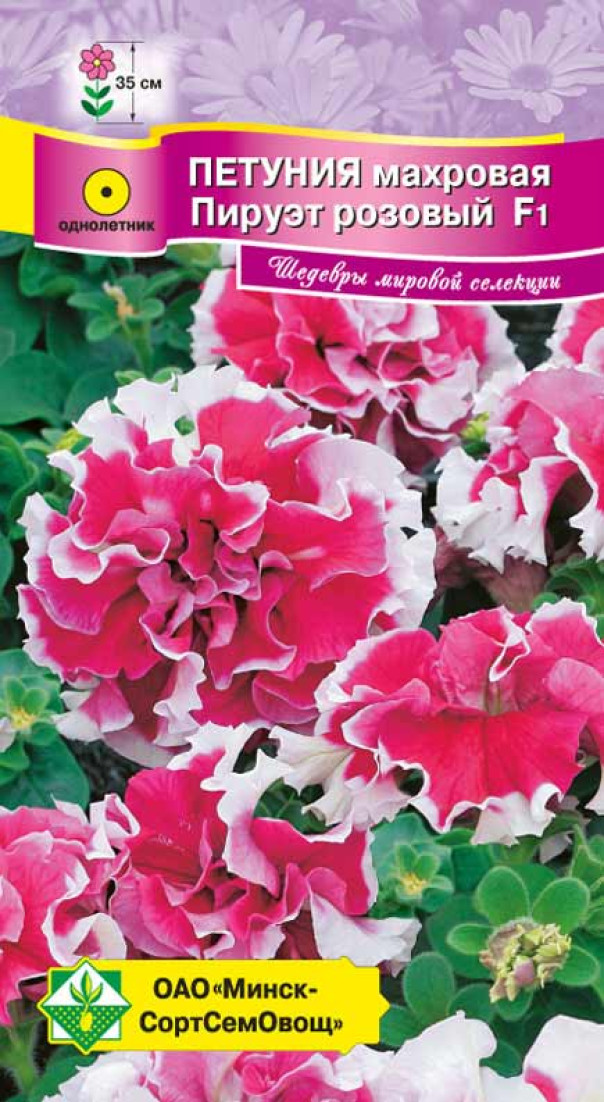 Однолетнее продолжительно и ярко цветущее растение высотой около 35 см. Цветки густомахровые, двухцветные, в диаметре 10-12 см. Необычная белая окантовка розовых цветков и сильная гофрировка лепестков делают эти петунии непревзойденными для оформления балконов, лоджий, клумб. Посев на рассаду производят в конце марта - начале апреля. Семена не присыпают, а слегка вдавливают в рыхлую влажную почву, посадочную ёмкость накрывают стеклом или плёнкой. Рассаду высаживают с середины мая.