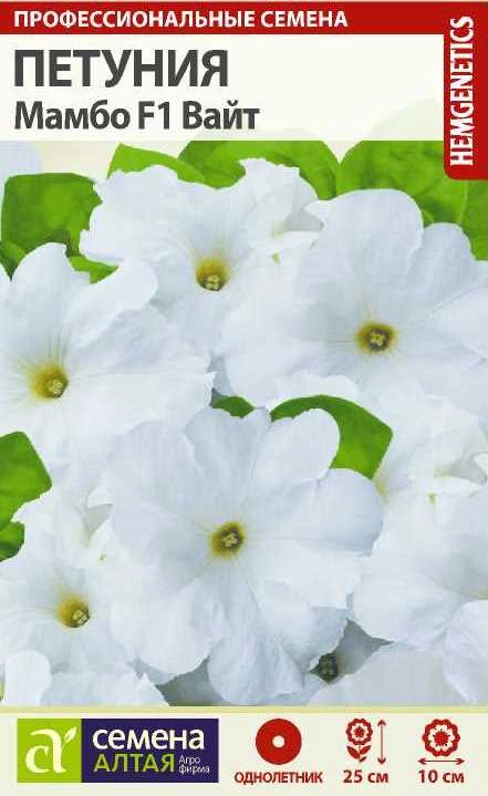 Генетически низкорослая серия многоцветковой петунии. Образует плотные компактные кустики высотой до 25 см, покрытые крупными, диаметром до 10 см, белоснежными цветками. Хорошо ветвится, не вытягивается в течение всего сезона. Отличается повышенной устойчивостью к неблагоприятным погодным условиям. Незаменима для оформления клумб, рабаток, отлично смотрится в вазонах, кашпо, подвесных корзинах, балконных ящиках. Светолюбивое и достаточно засухоустойчивое растение. Предпочитает легкие плодородные, хорошо дренированные почвы. Семена дражированные, что облегчает посев. В рассаде не перерастает, имеет очень хорошее ветвление. Семена высевают в феврале-марте, не заделывая землей, а просто накрывая ящики стеклом. Пока всходы мелкие, их лучше не поливать, а опрыскивать. На открытом воздухе продолжают выращивать с конца мая. Благодарно отзывается на поливы и регулярные подкормки. Возможно сохранение растений в зимний период в комнатных условиях.