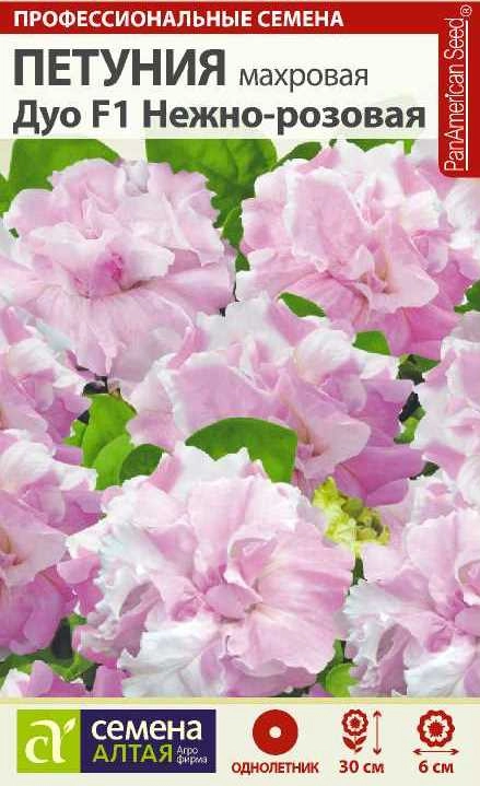 Эффектная махровая петуния с нарядной окраской цветков. Кустики ветвящиеся компактные, высотой около 30 см, усыпаны массой махровых нежно-розовых цветков с гофрированными лепестками. Растение устойчиво к похолоданиям и непогоде. Цветение пышное и длительное. Чудесно смотрится в балконных ящиках, цветниках, в групповых посадках на газоне. Семена на рассаду высевают в конце февраля - марте не заделывая землей, а просто накрывая ящики стеклом. Пока всходы мелкие их лучше не поливать, а опрыскивать. Пикировка в фазе 1-2 настоящих листочков. Высадка в грунт закаленной рассады в конце мая - начале июня, когда минует угроза заморозков. Спокойно переносят пересадку во взрослом состоянии. Возможно сохранение растений зимой в освещенном помещении при температуре около 12°С с предварительной обрезкой побегов.