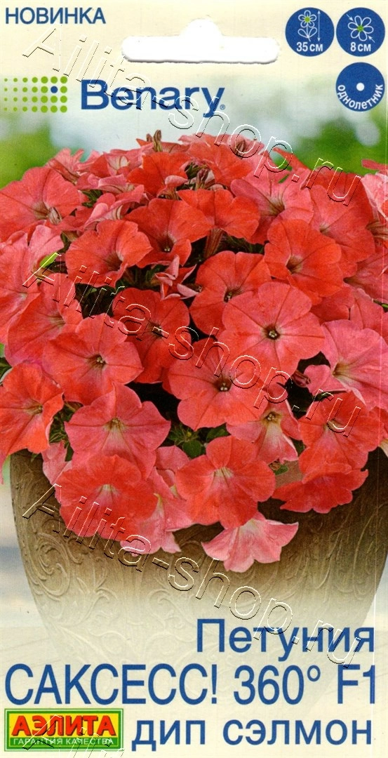 Необычная серия крупноцветковых петуний с громким названием «SUCCESS! 360° F1» («Успех!»). Растения настолько генетически однородные по своему габитусу, что обладают исключительной декоративностью при обзоре с любого ракурса! Кустики высотой около 30-35 см, шириной около 30 см. Обладают повышенной энергией роста, отлично ветвятся, образуя густой шар. Не требуют прищипывания и формирования. Цветки диаметром до 6-8 см, очень выразительные за счет насыщенной гаммы окрасок. Рано распускаются и далее непрерывно цветут, обильно украшая растения до осенних холодов. При должном уходе гибриды прекрасно растут в горшках, вазонах, балконных контейнерах. В садовых клумбах и рабатках они прекрасно выглядят в виде ковровых посадок.